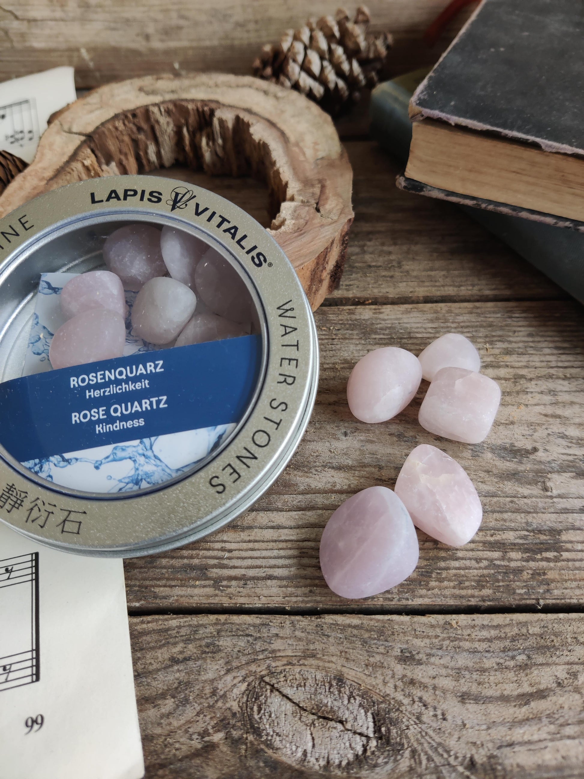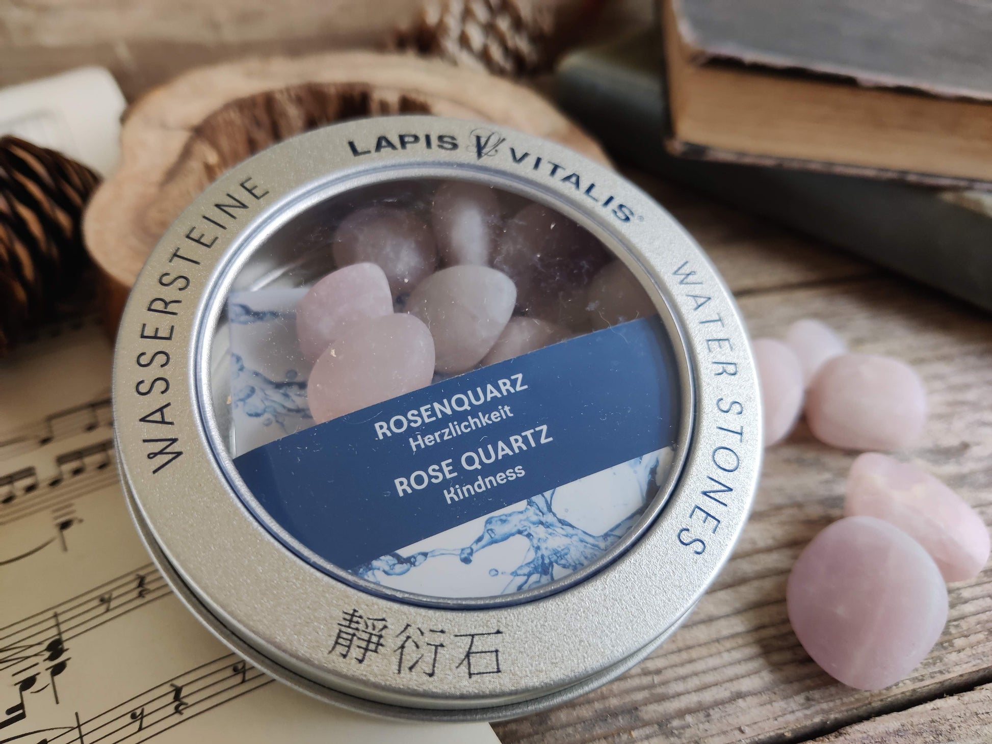 In der hübschen Metalldose findest du ca. 100 g vorgetrommelte Rohsteine, die keine scharfen Kanten haben und somit ideal für Edelsteinwasser sind.