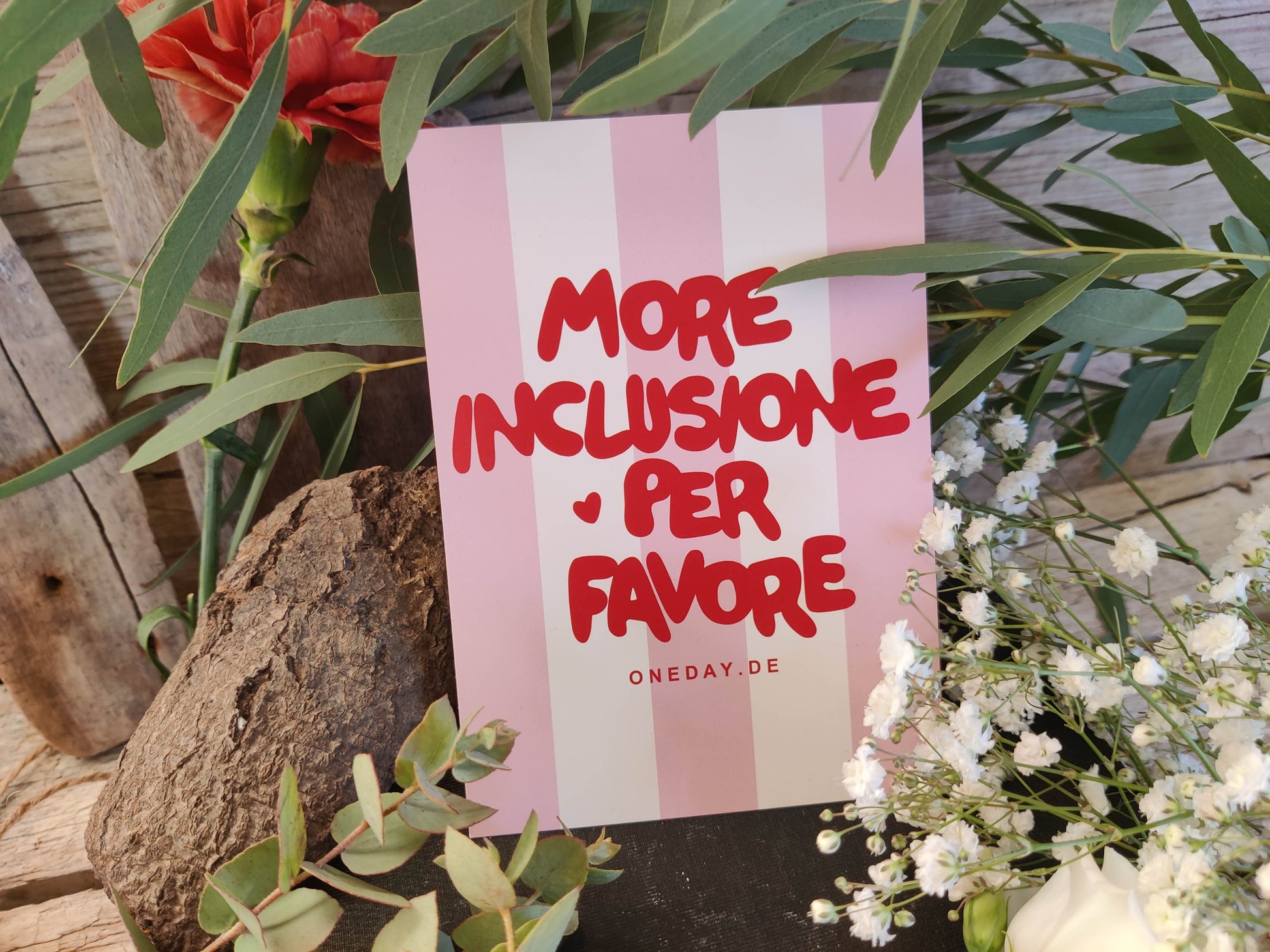 Die Postkarten „More Inclusione per favore“ sind ein klarer Aufruf zu mehr Miteinander. Mit ihrem modernen Design in Rosa, Weiß und Rot sind sie echte Hingucker – ideal zum Verschenken oder zum selber behalten und Aufhängen.