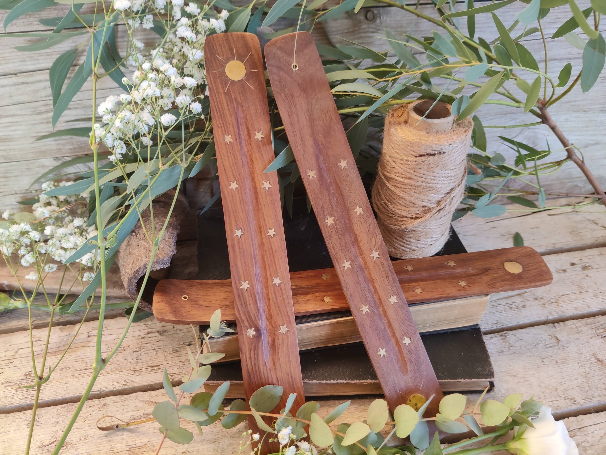 Dieser Räucherstäbchenhalter ist schlicht, edel und zeitlos. Mit einer feinen Messingeinlage versehen, zeigt er Sonne und Sterne – dezent im Design und angenehm zurückhaltend.