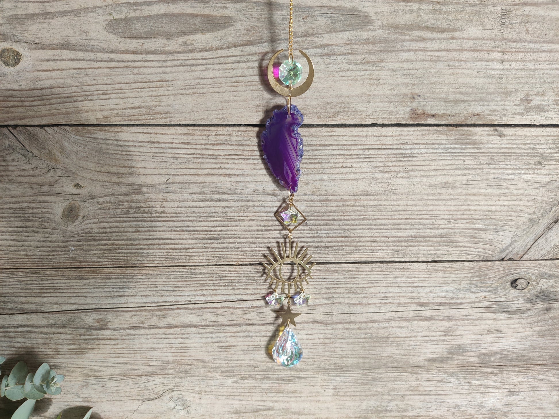 - Variante 2 – schützendes Auge & Achat: Kombination aus einem Achat-Rohstein, einem Mond-Element, einem Stern und dem schützenden Auge.