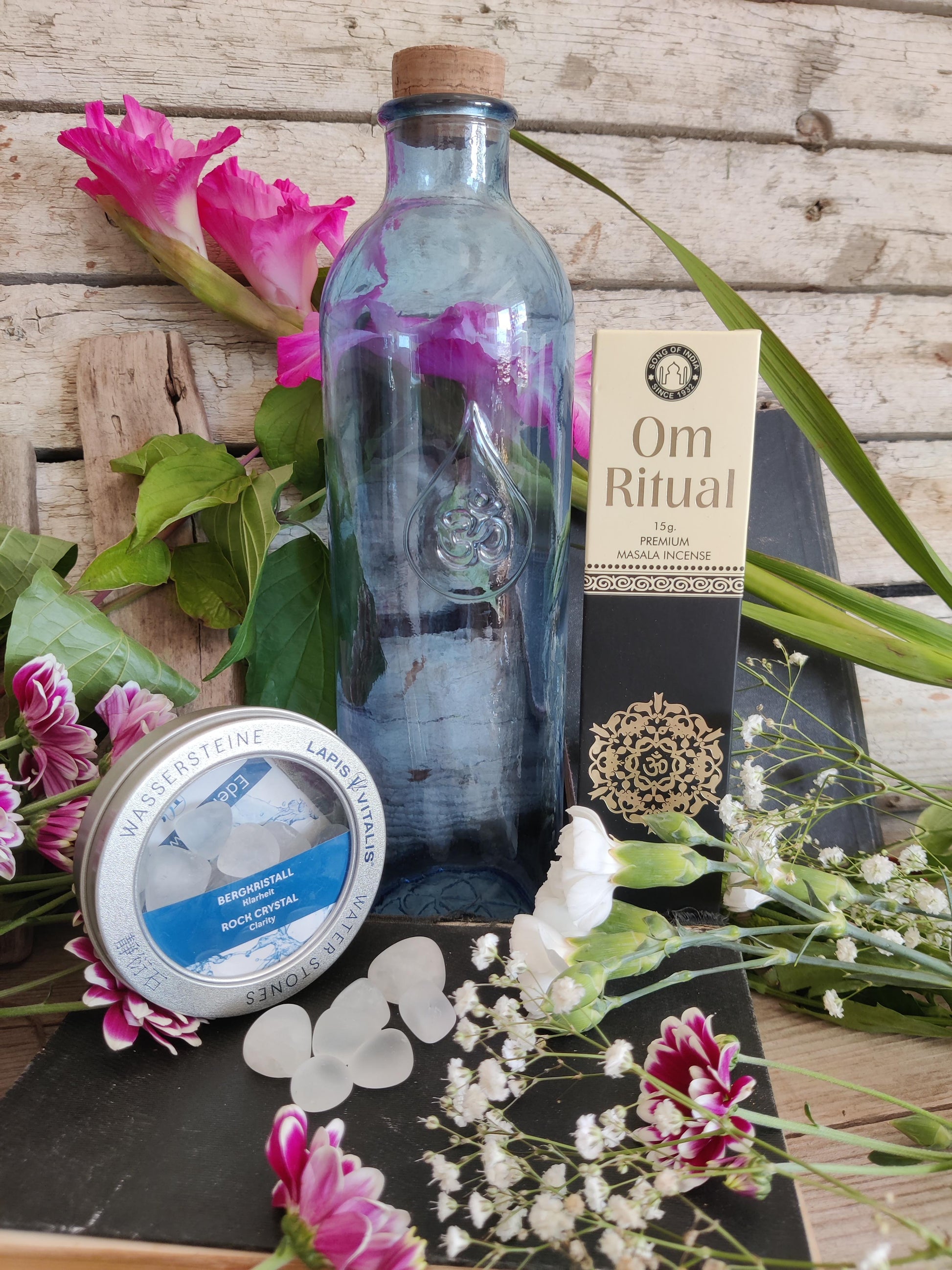 Die Wasserkaraffe „Om“ erinnert dich daran, bewusst zu trinken und dich mit deinem Körper zu verbinden. Die Bergkristall-Wassersteine harmonisieren dein Wasser und unterstützen Klarheit, Fokus und Licht im Innen. Die Räucherstäbchen „OM Rituals“ schaffen beim Abbrennen eine ruhige, friedliche Atmosphäre – ideal für kleine Pausen, Meditation oder sanfte Morgenmomente.